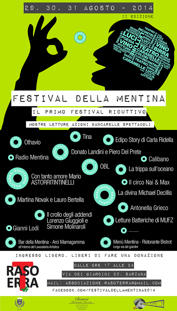Il Festival della Mentina 2014 si svolgerà a Sarzana il 29, 30 e il 31 agosto dalle 17:00 alle 24:00 lungo tutta Via dei Giardini e all’interno degli spazi del Lavoratorio Artistico che si affaccia sulla stessa via.