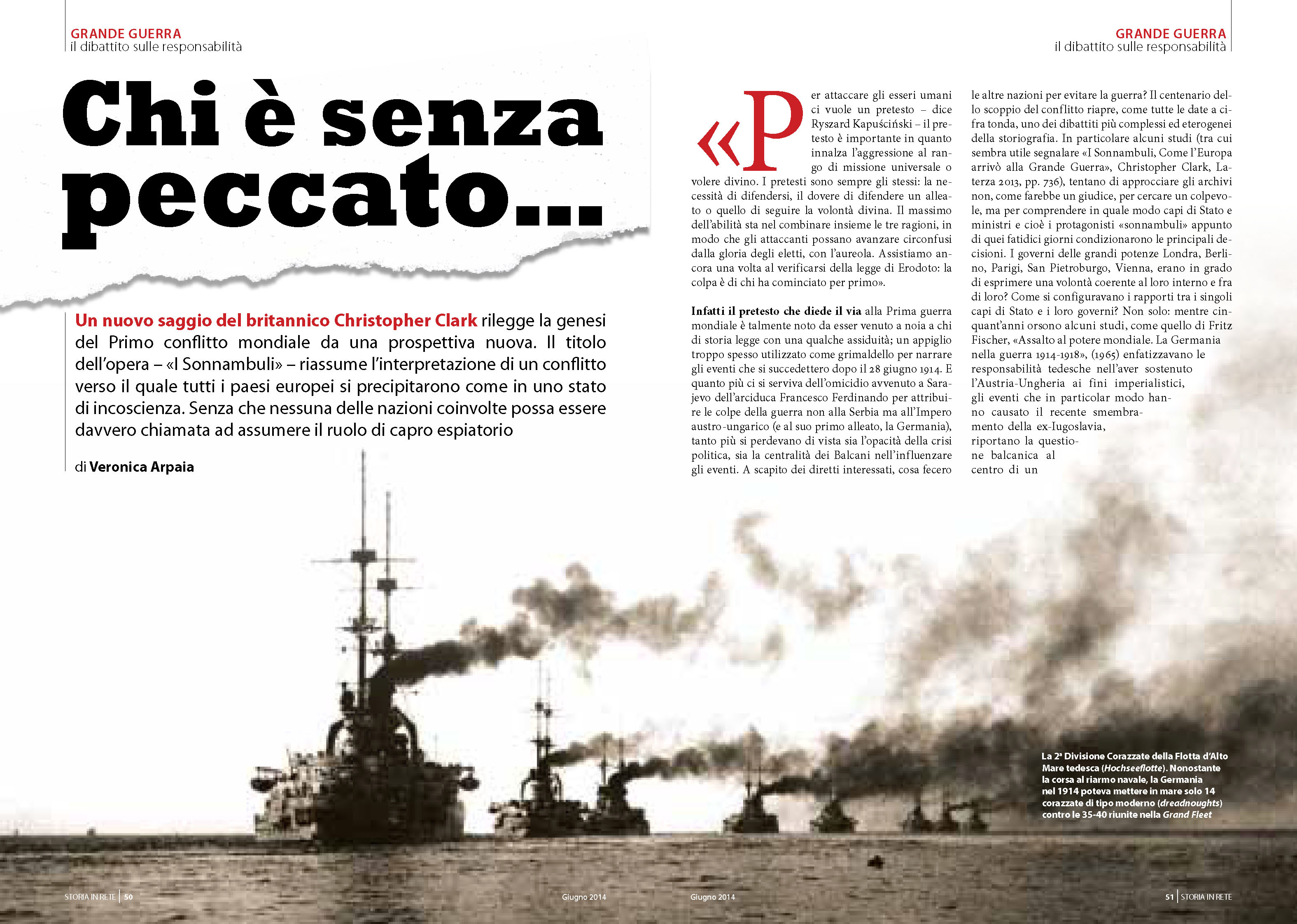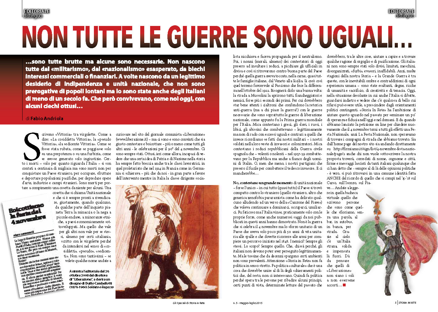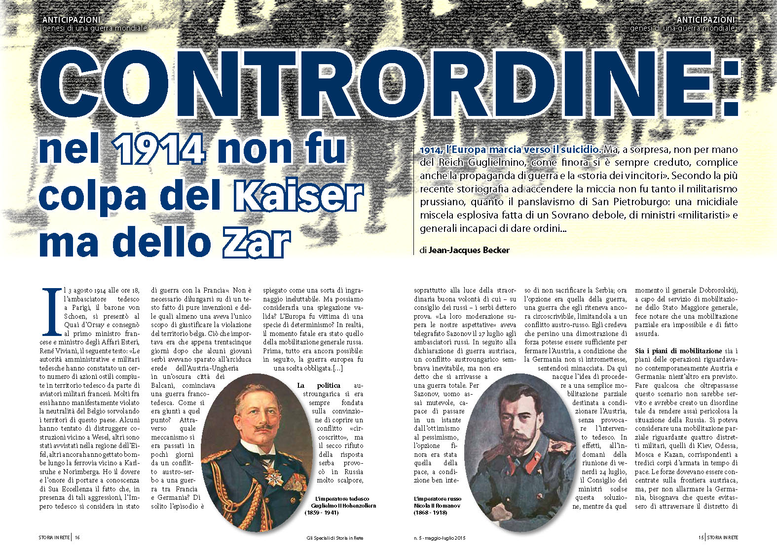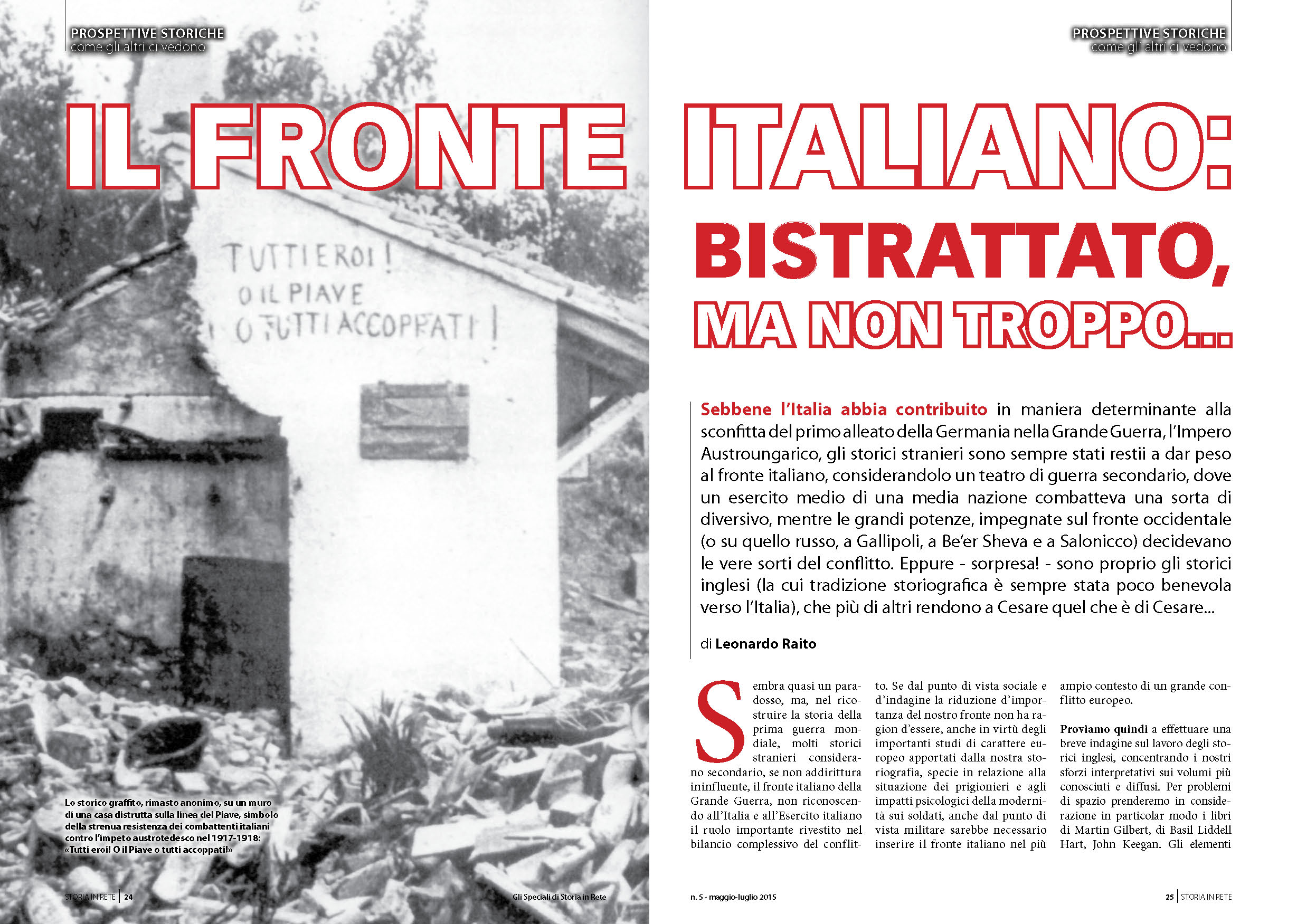 Da oltre dieci anni Storia In Rete, in edicola e sul web, propone una lettura della Storia fuori dagli schemi del conformismo e del politicamente corretto. Lo speciale sull'Italia nella Grande Guerra non farà eccezione: senza nascondere le luci e le ombre che accompagnano ogni azione umana, il nostro speciale racconterà come e perché l'Italia decise di entrare nella Prima Guerra mondiale. Una decisione maturata, come sempre accade, in circoli politici e culturali ristretti, ma che seppe alla fine coinvolgere gran parte della popolazione, accelerando la modernizzazione industriale del Paese, aumentando l'integrazione sociale tra i cittadini, aprendo spazi inediti alle donne, chiudendo definitivamente il processo risorgimentale portando i confini nazionali a coincidere con quelli storici e naturali.