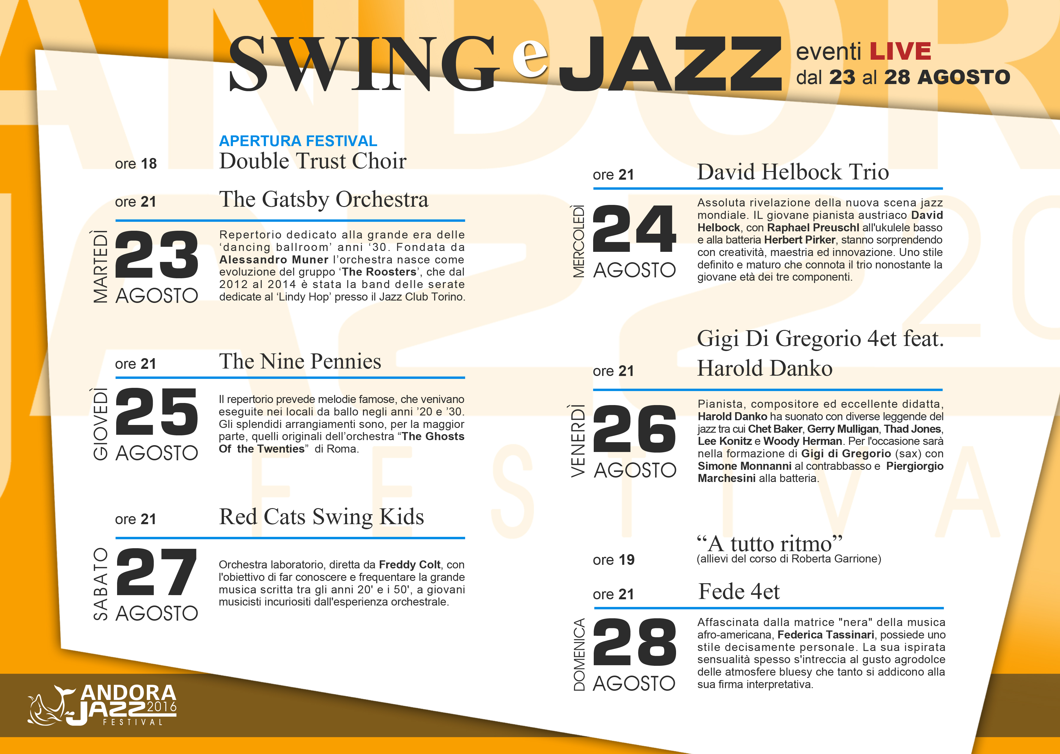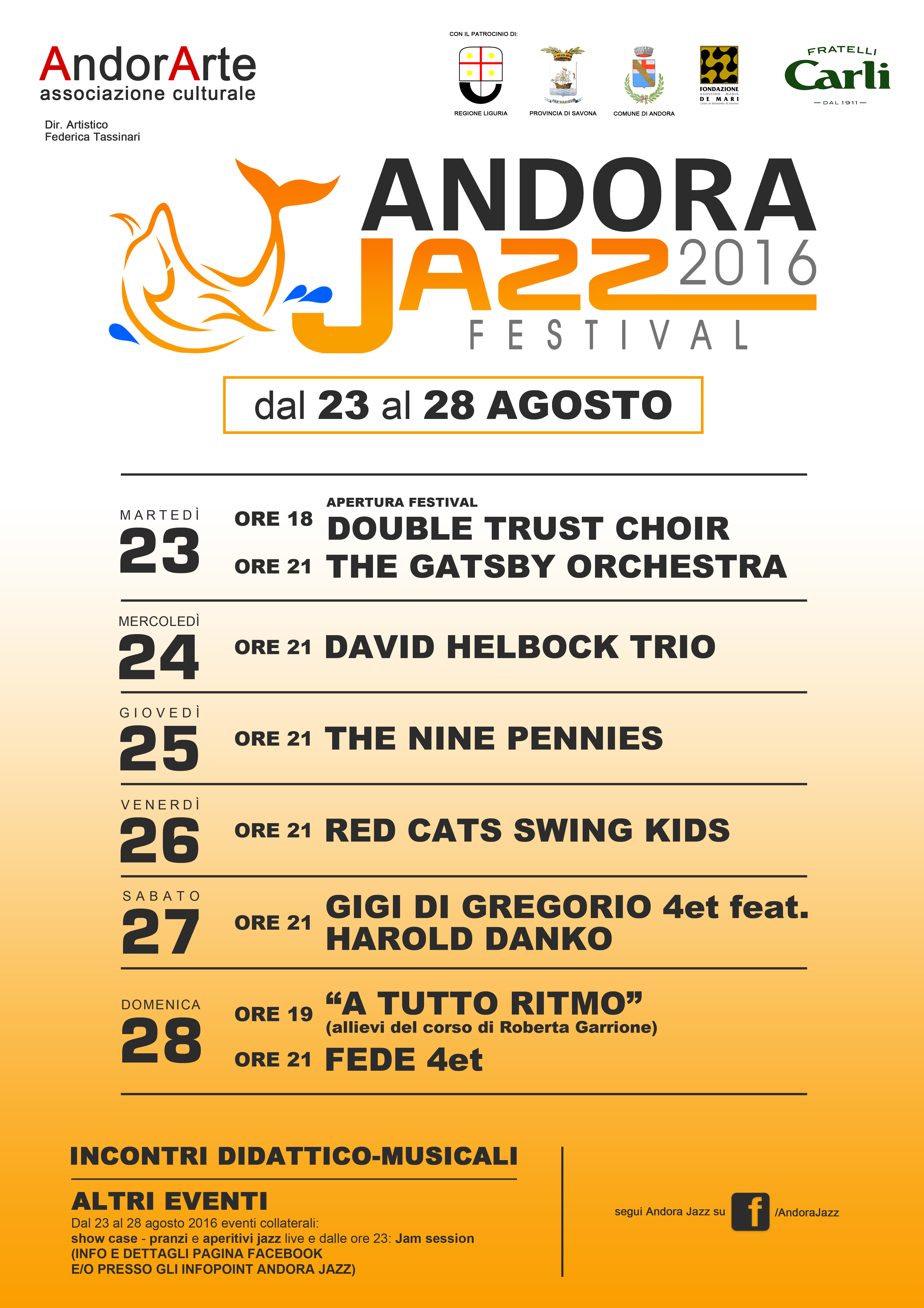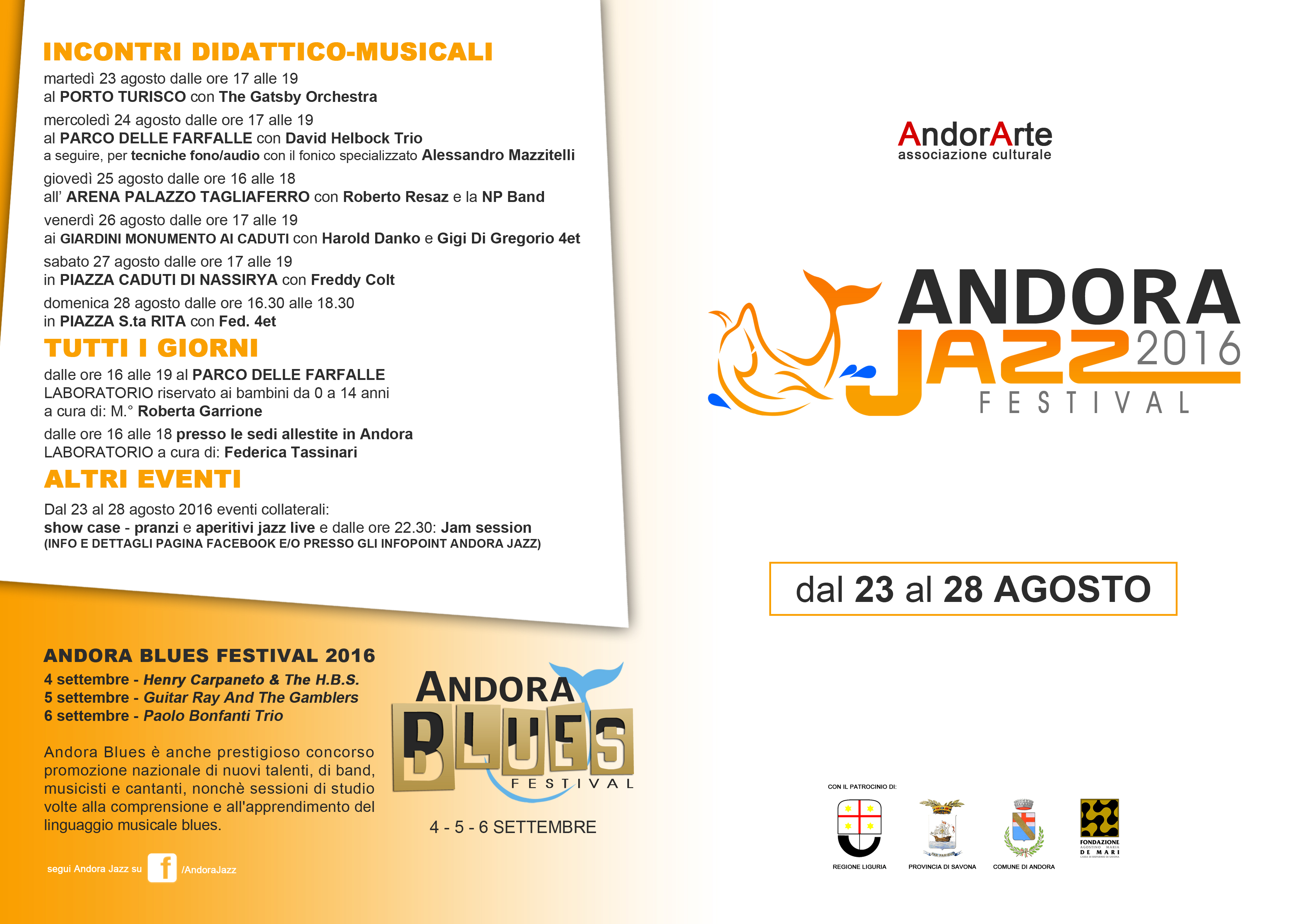 Il festival ANDORA JAZZ, giunto felicemente alla terza edizione, interesserà l'intero Comune di Andora durante il periodo 23 – 28 agosto 2016. Anche quest'anno, ANDORA JAZZ intende coniugare i valori didattici a quelli dell'intrattenimento proponendo un programma ricco, articolato ed importante, sviluppato durante l'intera settimana menzionata e volto ad incrementare l'interesse nei confronti di diverse forme artistico-musicali. Rilevante ed originale, sarà nuovamente la presenza di una specifica classe dedicata ai bimbi in età scolare e pre-scolare, ideata quale stimolo propedeutico prezioso per la sensibilizzazione ed il possibile sviluppo individuale futuro dell'arte musicale. Il corpo musicisti/docenti previsto, annovera la presenza di artisti di caratura e fama internazionale; l'organizzazione si prefigge di realizzare un appuntamento il cui livello qualitativo sia del tutto in linea con le più prestigiose manifestazioni italiane storiche.
