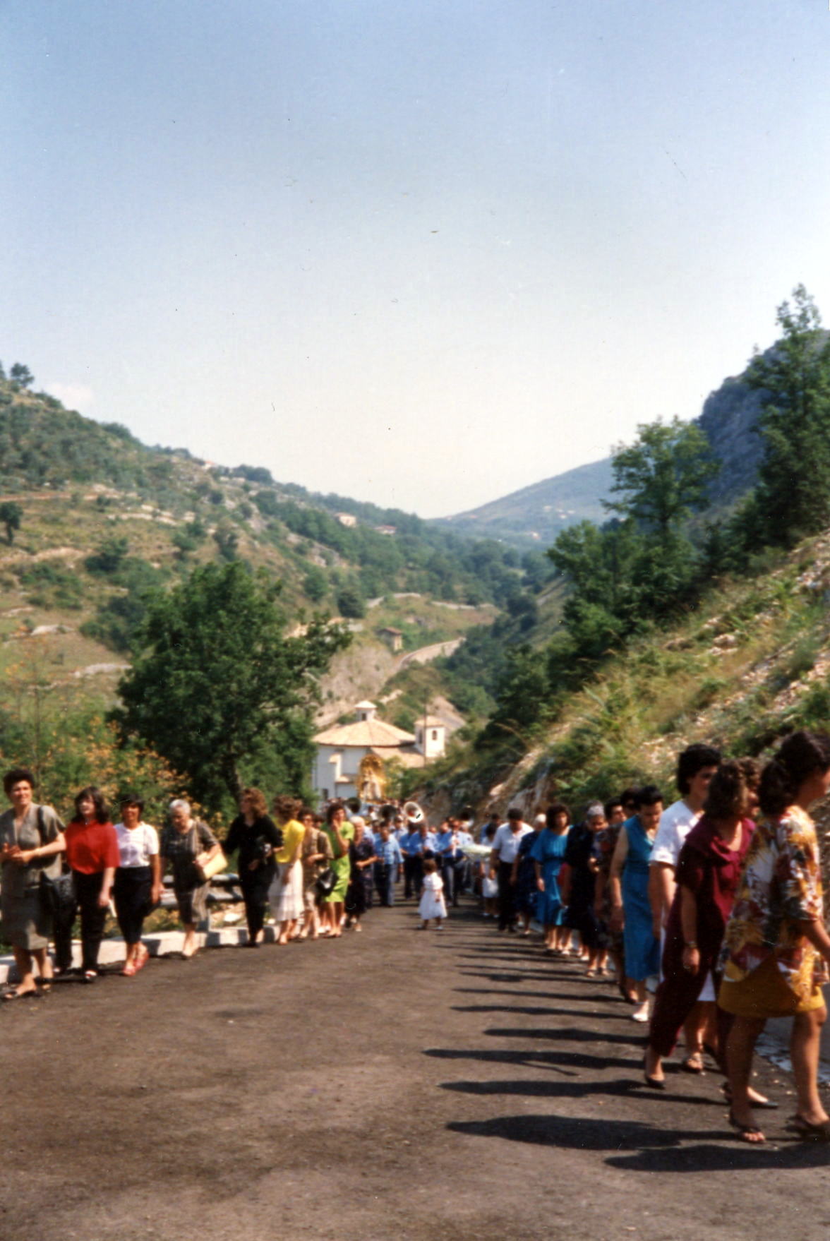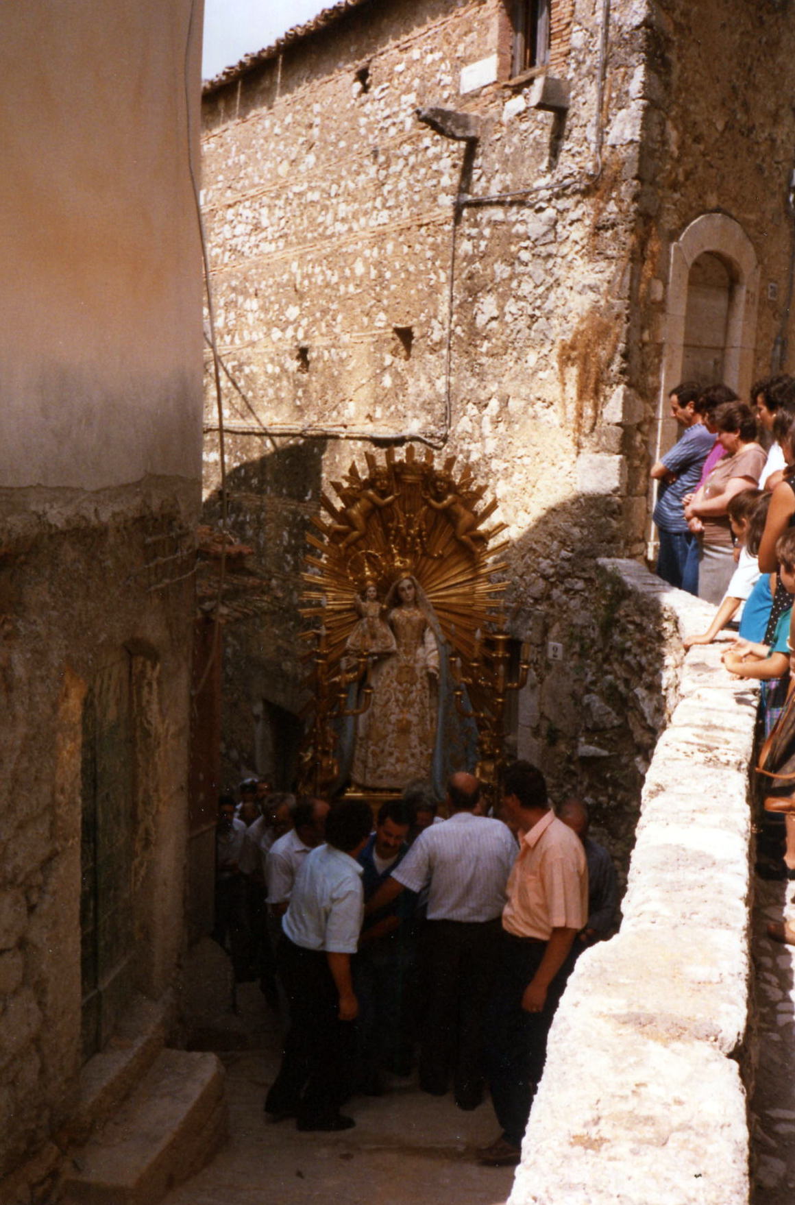 La mattina successiva di domenica, la statua è portata in processione per le vie del paese; in anni lontani, tutti aprivano le proprie case e aspettavano il passaggio della Vergine, ora molte case sono chiuse, alcune diroccate, altre acquistate e restaurate da qualche forestiero; l'emigrazione e l'invecchiamento degli abitanti ha spopolato il paese, e molti residenti sono sparsi nelle contrade della campagna circostante.