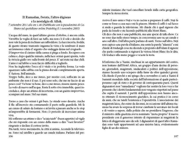 La maggior parte di queste note sono state scritte di notte quando, alla fine di una giornata di lavoro, tento di rimettere ordine nei pensieri accatastati, e cerco di far rivivere nella memoria le sensazioni provate nell’assistere ad un episodio recente, vissuto in prima persona o raccontato dai giornali o dalla televisione. In alcuni casi ho riproposto articoli che scrissi dal 2005 al 2015 sul qutidiano online Pratoblog, nato per iniziativa dell’amico Umberto Cecchi, che firmavo con lo pseudonimo Calibano. Da qui il titolo di questa raccolta.
